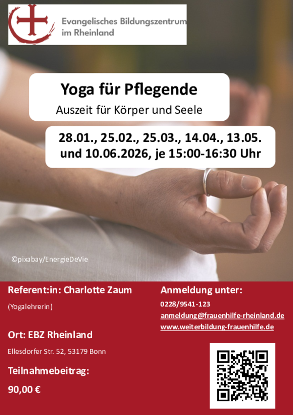 "Yoga für Körper und Seele" ermöglicht eine kleine Auszeit, ein wörtliches Durchatmen und gibt Impulse zur Selbstfürsorge mit, die leicht in den eigenen Alltag integriert werden können. Die Übungen können sowohl im Sitzen als auch am Boden stattfinden, verbessern die Beweglichkeit, Koordination, bauen Stress ab und steigern das allgemeine Wohlbefinden.