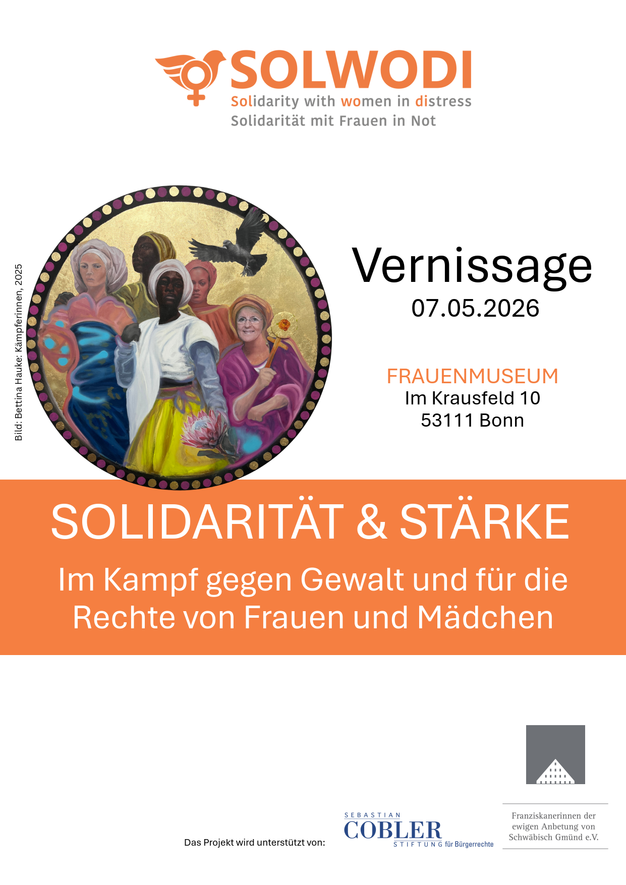Die Ausstellung ist vom 8. Mai bis 21. Juni 2026 im Frauenmuseum Bonn zu sehen. 32 Künstlerinnen setzen sich in Malerei, Skulptur, Installation und Multimedia mit den Lebensrealitäten von Frauen auseinander, die von Gewalt betroffen sind. Ergänzt werden diese künstlerischen Positionen durch persönliche Erfahrungsberichte von Zeitzeug*innen, die eindringliche Einblicke in individuelle Lebenswege sowie gesellschaftliche und politische Entwicklungen geben. Die Ausstellung „Solidarität und Stärke“ würdigt das Lebenswerk von Sr. Dr. Lea Ackermann, die 2023 verstorben ist. Als Gründerin von SOLWODI setzte sie sich über Jahrzehnte hinweg unermüdlich für den Schutz, die Rechte und die Würde von Frauen mit Flucht- und Migrationsgeschichte ein. Ihr Engagement bildet das Herzstück dieser Ausstellung, die die Themen Gewalt, Solidarität und Empowerment künstlerisch und gesellschaftspolitisch beleuchtet.