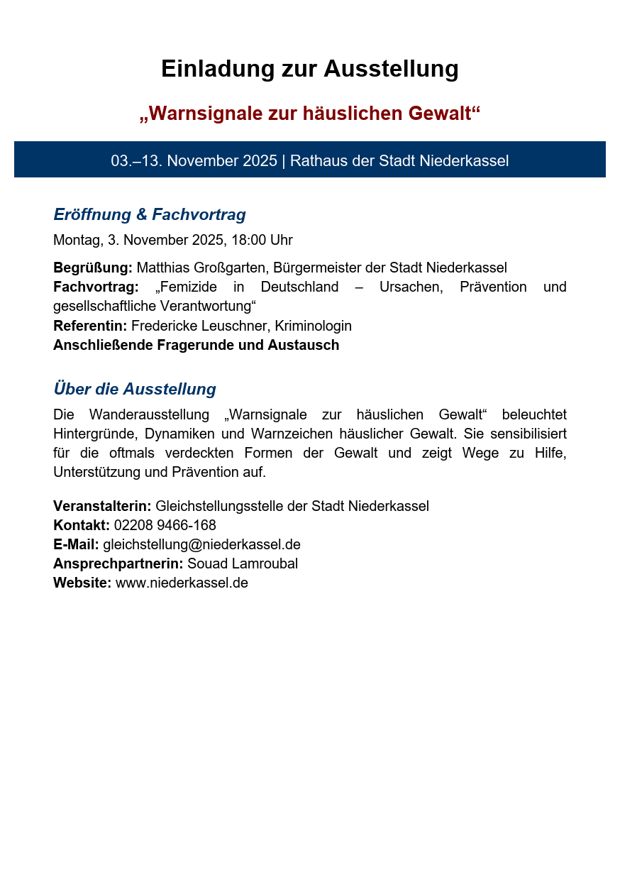 „Warnsignale zur häuslichen Gewalt“ am Montag, den 3. November 2025, um 18:00 Uhr im Rathaus der Stadt Niederkassel ein.
