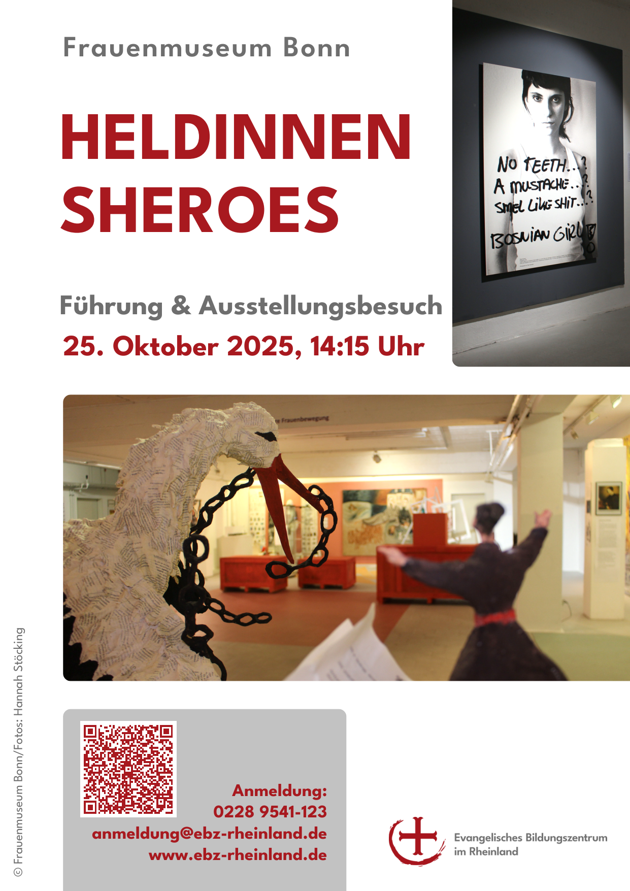 14:15 bis 16:30Mut, Selbstlosigkeit, ethische Prinzipien, Ausdauer, Entschlossenheit und Inspiration charakterisieren die Frauen, denen sich die aktuelle Ausstellung "Heldinnen / Sheroes" des Bonner Frauenmuseums widmet.