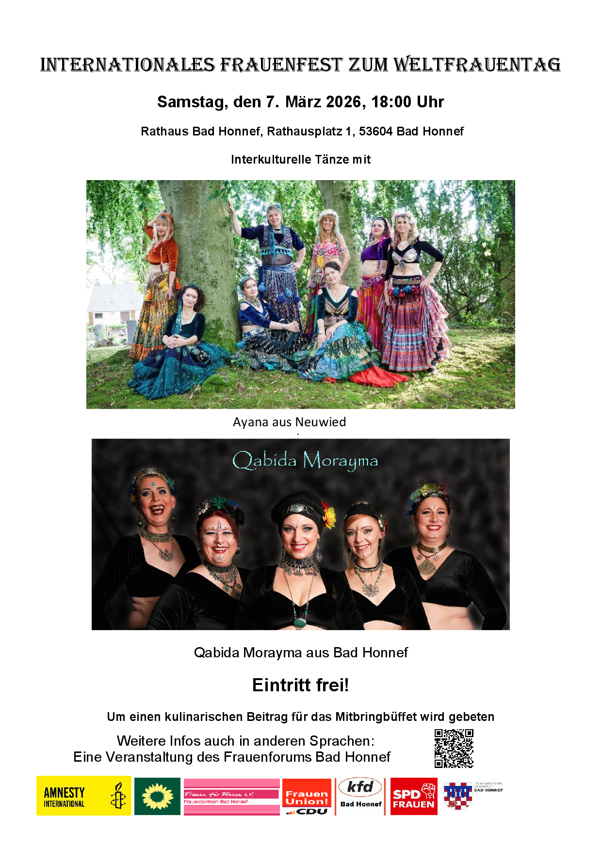 Zur Unterhaltung zeigen die Frauentanzgruppen Ayana (Neuwied) und Qabida Morayma (Bad Honnef) an diesem Abend verschiedene interkulturelle Tänze und laden anschließend tanzfreudige Frauen zum Mitmachen ein.