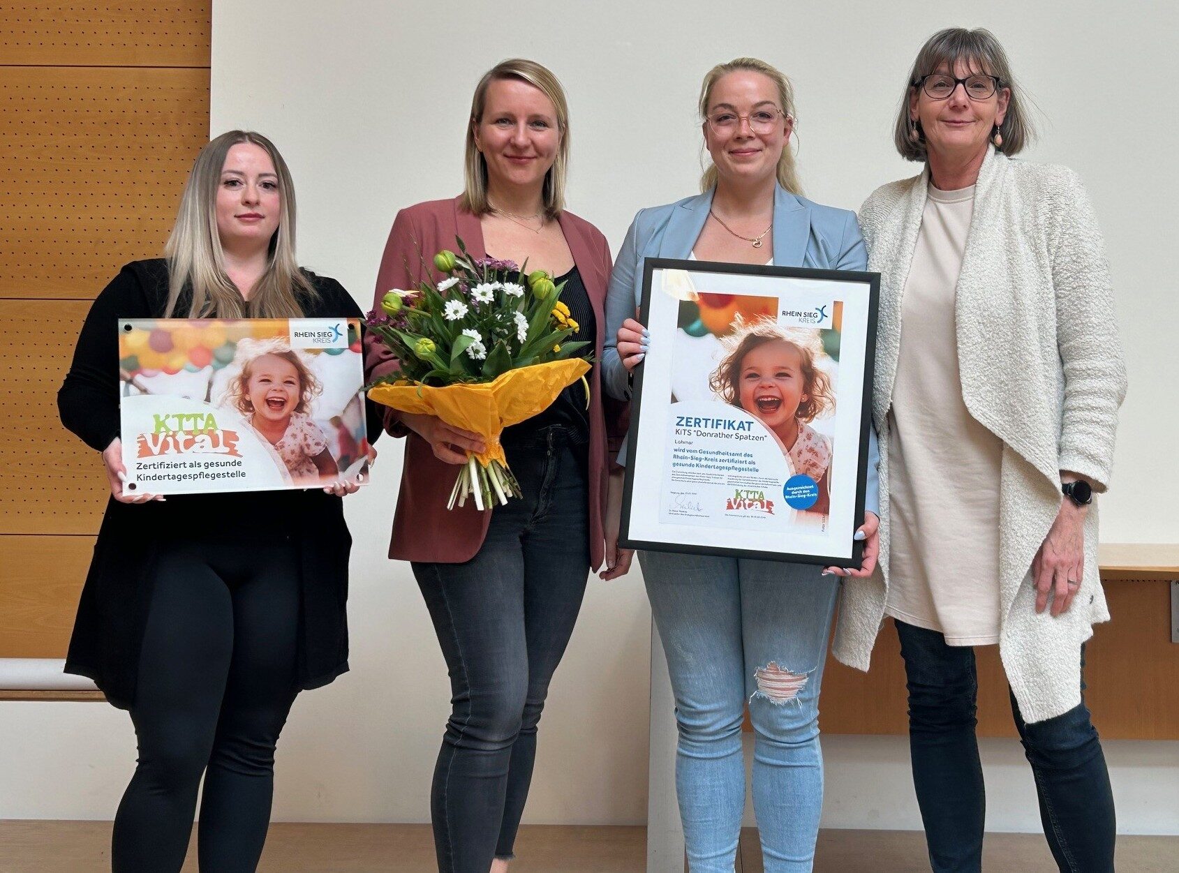 Die Kindertagespflegepersonen Patricia Lindenberg und Judith Linneborn-Zeemann von der „Kinderstube Giräffchen“, sowie Vanessa Besant, Jil Kümmler-Lutomski und Irene Pries von der „KiTS Donrather Spatzen“ erhielten aus den Händen von Ralf Thomas, dem Leiter der Abteilung Verwaltung und Gesundheitsförderung im Kreisgesundheitsamt und Yasmin Gross, das Zertifikat „KITA Vital gesunde Kindertagespflegestelle“ für die Weiterentwicklung von Strukturen und Angeboten, die nachhaltig zum gesunden Aufwachsen der Kinder in ihrer Einrichtung beitragen.