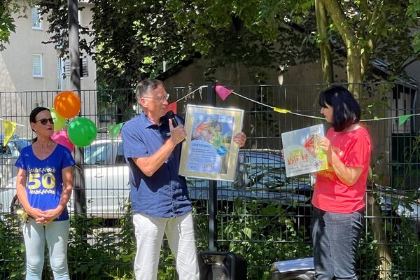 Unter dem Motto "Gemeinsam sind wir kunterbunt" feiert die Kindertagesstätte „Julius-Leber-Straße“ 50-jährigen Geburtstag. Mit vielen Attraktionen für Groß und Klein wurde das runde Jubiläum in und um die Kita begangen. Und ein neues Zertifikat und Türschild zu KITA Vital gab es auch.