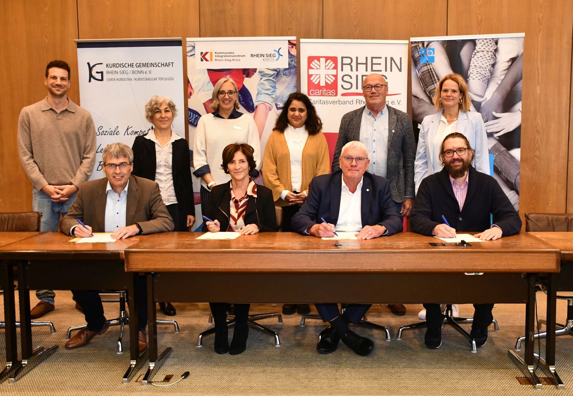 Landrat Sebastian Schuster und Harald Klippel, Vorstandsvorsitzender des Caritasverbands Rhein-Sieg e.V., Patrick Ehmann, Geschäftsführer der Diakonie An Sieg und Rhein sowie Fatma Çeşme, Vorstandsvorsitzende der Kurdischen Gemeinschaft Rhein-Sieg/Bonn e.V., unterzeichneten jetzt im „Dr.-Franz-Möller-Saal“ des Siegburger Kreishauses die Kooperationsvereinbarung „Siegel für Vielfalt“.