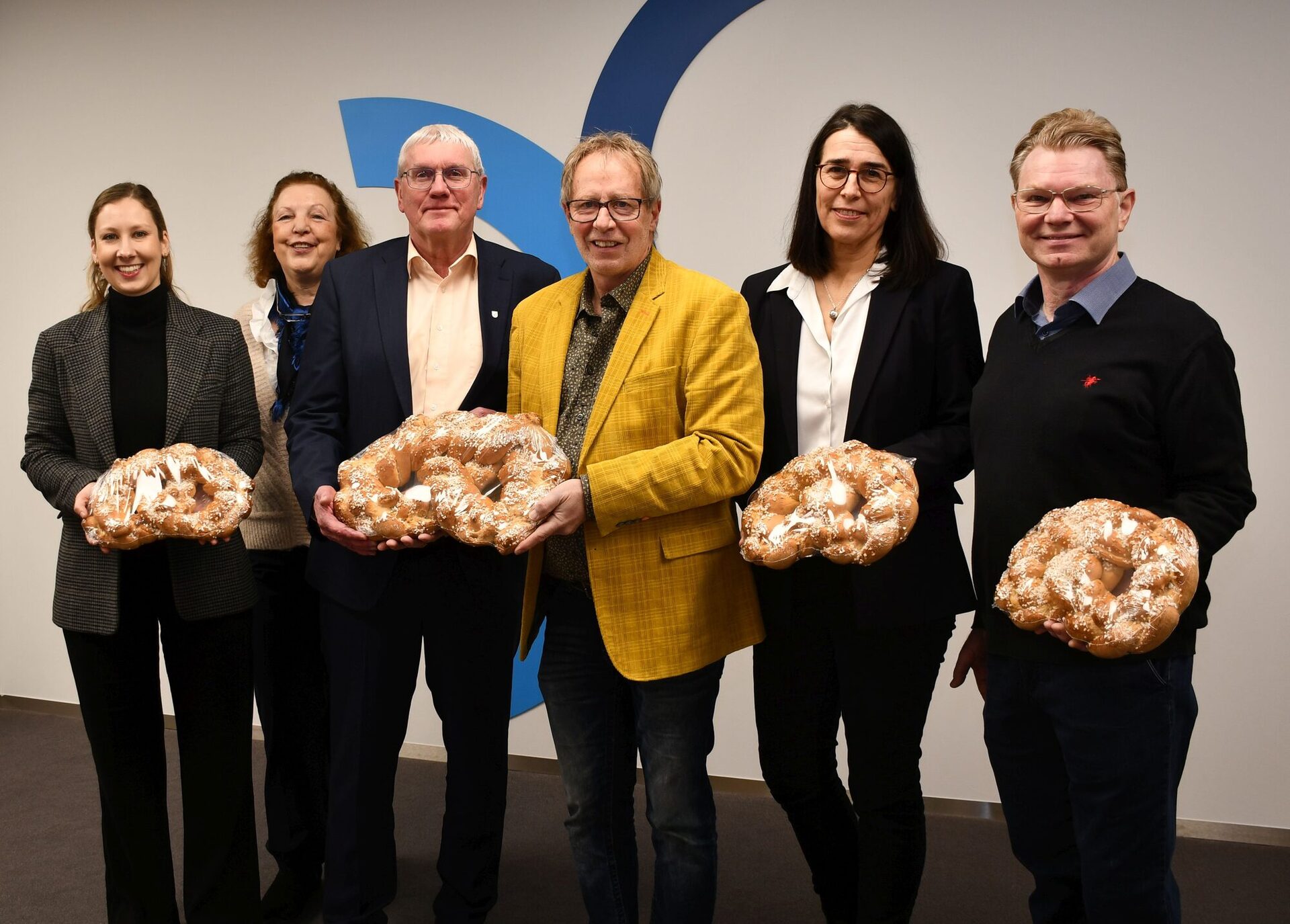 Rhein-Sieg-Kreis (an) – Das heimische Bäckerhandwerk steht für Qualität und Tradition - davon konnten sich Landrat Sebastian Schuster und Kreisdirektorin Svenja Udelhoven überzeugen, als beide auch in diesem Jahr die Neujahrsbrezel der Bäcker-Innung Bonn/Rhein-Sieg im Siegburger Kreishaus in Empfang nahmen. Traditionell überreicht Bernd Rott, Obermeister der Bäcker-Innung gemeinsam mit weiteren Mitgliedern des Vorstandes zum Jahresbeginn den süßen Talisman an die Verwaltungsleitung.
