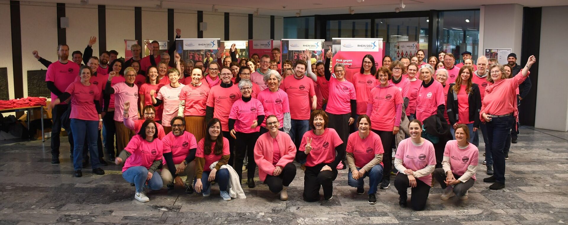 Und auch das schon traditionelle Gruppenfoto durfte im Rahmen der Aktion „Pink gegen Rassismus“ in diesem Jahr nicht fehlen: Gemeinsam mit Kreisdirektorin Svenja Udelhoven zeigten etliche Mitarbeiterinnen und Mitarbeiter der Kreisverwaltung und des Kreissportbundes ganz in Pink Haltung.