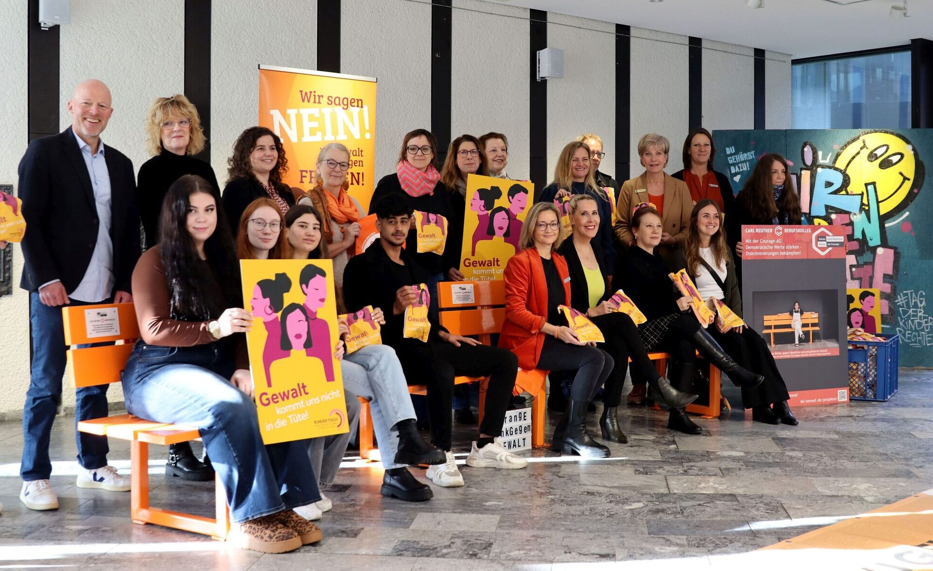 Inzwischen beteiligen sich immer mehr Schulen im Rhein-Sieg-Kreis an präventiven Aktionen. Die seit dem Jahr 2021 im Kreisgebiet aufgestellten „Orangen Bänke gegen Gewalt“ eignen sich sehr gut, um das Thema „Gewalt an Frauen“ stärker in das Zentrum der öffentlichen Wahrnehmung in den einzelnen Kommunen zu rücken. Auch sie weisen über Plaketten auf regionale Hilfsangebote hin. Wurden die Bänke zunächst an prominenten Plätzen vor Rathäusern, dem Kreishaus oder auf öffentlichen Plätzen aufgestellt, kamen in den letzten Jahren mehr und mehr Bänke auf Schulhöfen beziehungsweise an Jugendzentren hinzu. Zum Ende des Jahres werden im Rhein-Sieg-Kreis mehr als 70 orange Bänke stehen.
