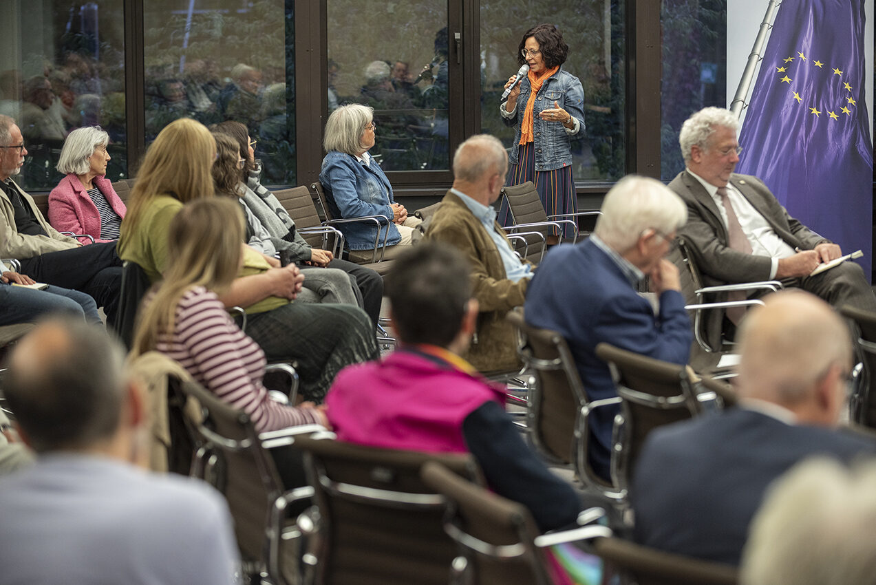 Aus dem Speakers-Pool Team EUROPE DIRECT der Europäischen Kommission beleuchtete Anke Wekerle die europäische Dimension und verwies auf die neuen Regelwerke Digital Services Act (DSA) und Digital Markets Act (DMA), die Bürgerrechte und faire Wettbewerbsbedingungen im Netz sichern sollen.