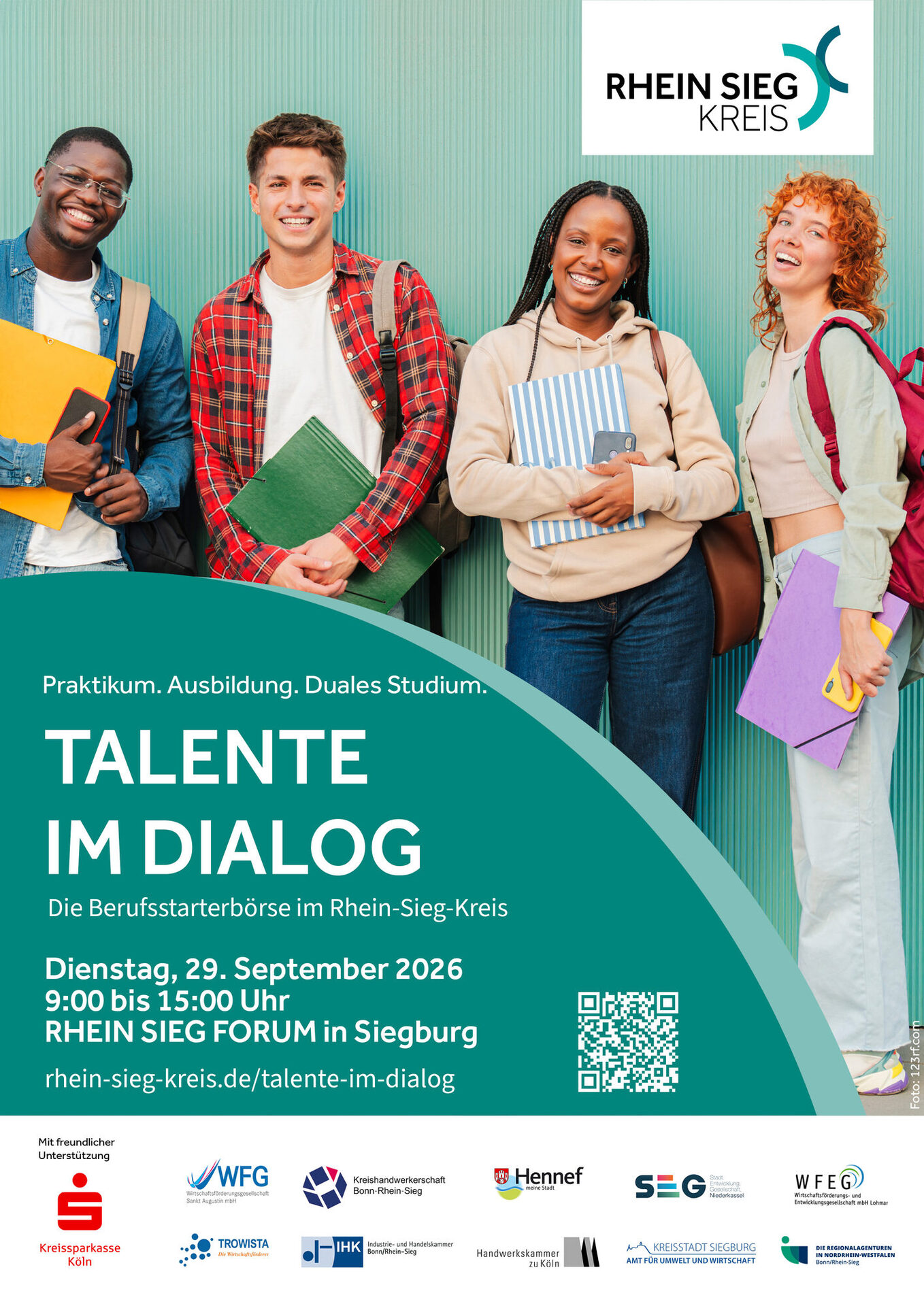 Die Berufsstarterbörse "Talente im Dialog" findet am Dienstag, 29. September 2026, von 9:00 Uhr bis 15:00 Uhr im RHEIN SIEG FORUM in Siegburg statt.